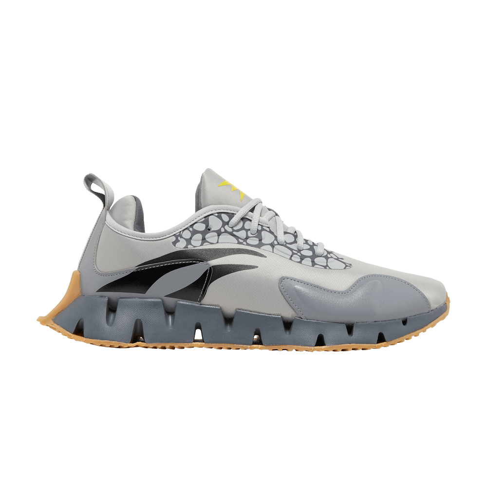 The Reebok Zig Dynamica 'Mighty Morphin' is a subtle nod to the Power Rangers, featuring a sleek, grey design with dynamic side stripes and a crackle effect, embodying the power and agility of the Rangers.